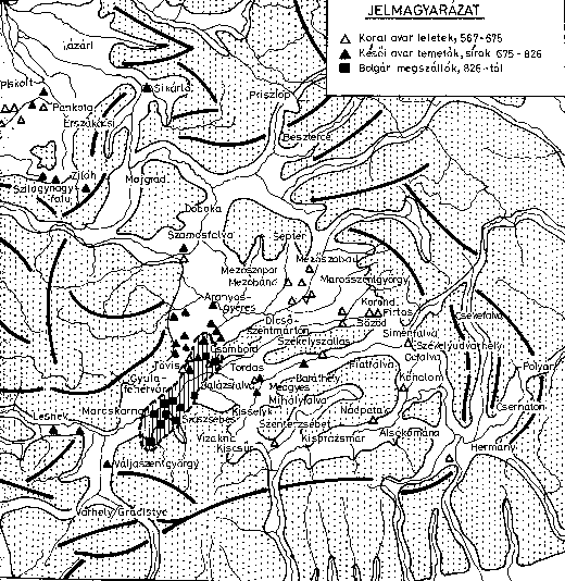 Az adott helyzet mérlegelése alapján tehát Árpád népének legkorábbi régészeti hagyatékát Erdélyben, sõt mindenekelõtt annak északi részében kell remélnünk, hisz a régészeti maradványok, történelmi és nyelvészeti bizonyítékok vallomása szerint (2. rajz) bércek koszorúzta szûkebb hazánknak legalább a hajdani Torda vármegye déli peremétõl az Erdélyi-havasok („Déli Kárpátok”) felé esõ nagyobbik része Omurtág bolgár kán seregeinek 827–834 közötti hadjárata óta a dunai bolgár államhoz tartozott.[23]