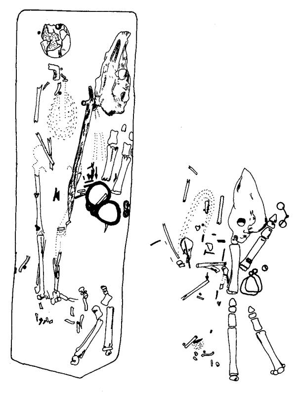 3. 9–10. századi honfoglalás kori szablyás és lovas harcos sírja (balra) és honfoglalás kori lovas harcos korabeli sírfosztogatóktól megbolygatott temetkezése (jobbra) a kolozsvári Zápolya utcából. ET. 204. 11. ábra után.