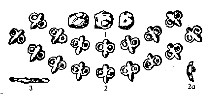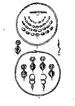 5. Díszes viseletben elhantolt, honfoglalás kori, középrétegbeli nõi sír mellékletei Marosgombásról. Erdélyi Irodalmi Szemle IV (1927). 260. 1. rajza után: 1, 3. rossz ezüstbõl készült, de vékony aranylemezzel bevont füles függõk; 2. négyágú csillagra emlékeztetõ kisebb boglár; 4 – 4a. a 10–10a. és 13–13a. szám alatt ábrázolthoz hasonló, átlyukasztatlan dísz (rozetta); 5–8. övdíszként alkalmazott, aranyozott, sarkain átlyukasztott, szívidomos sarkú bronzboglárok. A szívidomok középütt karikataghoz tapadnak; 7–7a. kétrészes, füles csüngõ; 10–10a. 13–13a. két, azonos szívidomú csüngõvel ellátott ékesség; 11–11a. négykaréjú, szívidomú levelet ábrázoló bronzpitykék. Az egyik szárát alkotó szegecsszerû nyúlvány még a sírba tétel elõtt letörött; 12. gömbszelvény alakú, középen benyomott s a fölvarrást megkönnyítõ, kétlyukas bronzpityke; 14. végein átfúrt, nyitott bronzkarperec; 15. vas ár; 16–16a. üvegpépbõl készült gyöngy; 17. összegöngyölt bronzlemez; 18. dinnyére emlékeztetõ háromgerezdes gyöngy; 19. üvegpépbõl készült gyöngyök, egyeseket vonalas máz díszíti, a vonalak négyszöget alkotnak, bennük egy-egy „odacseppentett” lapos pont ül; 20. négyzetes hasáb alakú, fonás díszû gyöngyök; 21–24. átfúrt kauri kagylók; 26. sima gyöngyök; 27. az elõbbiek rokona; 28–30. ólomlemezekbõl hajlított, nyakon és mellen fekvõ, gyöngyként (?) használt ólomlemezek, a 28. számút körrel kerített, bibircsókszerû dísz ékíti; 31. hengeres, egymás fölé helyezett körökkel és felfutó indaszerûen kezelt gyöngyök; 32. felsõ részükön füles, erezett ékû gyöngyök; 33. keskeny, hengeres gyöngyök.