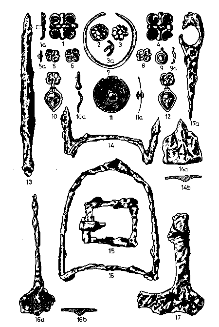 6. Lovas férfi sírmellékletei Magyarlapádról. Erdélyi Irodalmi Szemle IV (1927). 262. 1. rajza után. 1, 4. bronzboglárok; 2–3. virágszirmot utánzó bronzpitykék; 5–6, 8. a 10, 12. alattiak édestestvéreiként tekinthetõ bronzpitykék; 9. hiányzó csüngõ tagú rossz ezüstpityke; 10, 12. csüngõs bronzpitykék; 11. gömbszelvény alakú bronzgomb; 13. köpûs vas lándzsacsúcs; 14, 16. vaskengyelek; 15. vas szíjcsat; 17. vasbalta.