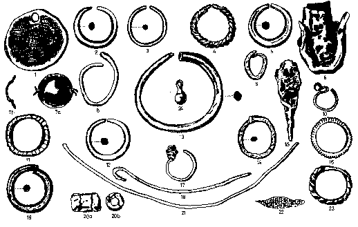 9. A vajdahunyadi honfoglalás és kora Árpád-kori magyar temetõ leleteinek egy csoportja. Dolg. IV (1913). 170. 1. 3. ábra után: 1. Ioannész Tzimiszkész (969–976) vagy IX. Kónsztantinosz érmébõl kalapált, átfúrt, nyakékként viselt csüngõdísz a 44. sírból; 2. vége felé vékonyodó, tojásdad metszetû, nyitott bronzkarika a 44. temetkezésbõl; 3. nyitott végû, sima ezüstkarika a 13. sírból; 4. hármas fonású ezüstkarikák a 12, 28, 31–32. temetkezésbõl; 5. vége felé vékonyodó, nyitott végû bronzgyûrû; 6. rossz ezüstbõl készült, összehorpasztott, valamikor hengeres lemezbõl készült tárgy, egyik vége természetesen, pohárszerûen nyitott, másik fele domború, itt átlyukasztották; 7–7a. hármas tagolású, két helyen átlyukasztott, a megtalált kenderfonállal inghez fogott, gömbszeletes ezüstgomb a 41. temetkezésbõl; 8–9. nyitott végû bronzkarikák a 41. sírból; 10. kora Árpád-kori S végû hajkarika a 3, 14, 16, 22, 28, 30, 34, 49. sírból és szórványos lelet; 11. rovátkolt ezüstgyûrû a 43. temetkezésbõl; 12. nyitott végû bronzkarika a 12, 14. sírból; 15. erõsen megevõdött, 44 mm hosszan megmaradt, rombusz alakú honfoglalás kori vas nyílhegy; 16. félkörös metszetû, külsején rovátkákkal díszített, rossz ezüstbõl készült gyûrû a 39. sírból; 17. csigavonalas végzõdésû, fél mm vastag, ezüstsodronyból való hajkarika a 27. temetkezésbõl; 18, 21. hengeres metszetû, 1 mm vastag, horgas bronztárgy, egyik vége látszólag hegybe fut, folytatása végein régi törés nyomai (nyilván hajdanán egyetlen tárgyként viselt egyszerû nyakperecrõl van szó) a 27. sírból; 19. egymásra hajlított végû bronzgyûrû a 43. temetkezésbõl; 20–20b. hengeres gyöngy üvegpépbõl a 6. sírból; 22. kenderszövet-foszlány a 41. sírból; 23. fonást utánzó, félkörös metszetû, ferdén rovátkolt felületû ezüstgyûrû a 39. temetkezésbõl; 24. füles bronzgomb a 44. sírból, valamennyi 1/1 méretben