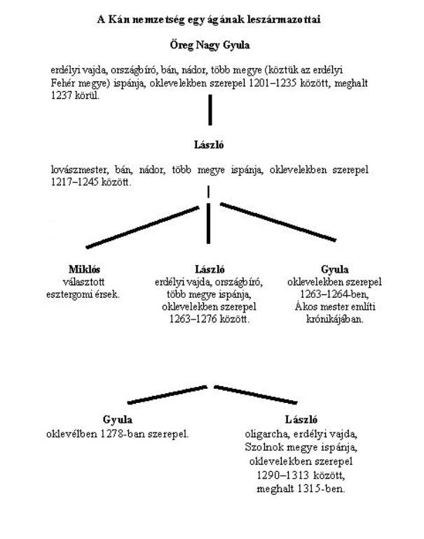 Keán dél-erdélyi volta mellett – úgy tûnik – még egy perdöntõ bizonyítékot felsorakoztathatunk. Ez pedig a középkori Keán (Kán) nemzetség korai története. (E nemzetség legfontosabb ágának vázlatos leszármazási tábláját l. alább.) Ismeretes, hogy e nemzetség birtokai – kisebb tömböktõl eltekintve – két területen: Baranya megyében és Erdélyben csoportosultak.[23] A XIV. századi krónikakompozíció Ákos mester által írt része a XIII. század közepén élt László fia Gyulát egyenesen a honfoglaló Gyulától eredezteti,[24] márpedig e László fia Gyula Kán nembeli elõkelõ volt. Magunk úgy véljük, krónikás kombinációval állunk e helyütt szemben. László fia Gyulát legalábbis két ok miatt kapcsolhatta a XIII. század végi krónikás az erdélyi Gyulák családjának honfoglaló tagjához. Egyrészt a középkorban oly fontos szerepet játszó névmegfelelés miatt: Ákos mester számára kézenfekvõnek tûnt a 900 körül élt Gyulát a vele kortárs, azaz XIII. század közepi (László fia) Gyula õsének megtenni.[25] Másrészt: mivel e Gyula személyes ismerõse lehetett Ákos mesternek, a krónikás tudhatta, hogy birtokai vannak Erdélyben, ott, ahol a honfoglaló Gyula megtelepedett. E két mozzanatnak alkalmasint már egyike elégséges lehetett volna a szerzõnek a honfoglaló Gyula és a vele kortárs László fia Gyula közti vérségi kapcsolat megalkotására, e két körülmény egybehangzónak tûnõ tanúsága alapján pedig e kapcsolat immár maga lehetett a megfellebbezhetetlen bizonyosság. Pedig tévedett: az erdélyi Gyulák törzsébõl az az öt észak-erdélyi nemzetség eredeztethetõ, amely a középkori Erdélyben Belsõ-Szolnok, Doboka és Kolozs megye területén birtokolt: azaz a Borsa, az Agmánd, a Zsombor, a Szil vagy Kalocsa nemzetség és a Mikola rokonság.[26] A Kán nemzetség feltételezésünk szerint a dél-erdélyi, Szent Istvánnal szemben csatát vesztõ Keántól származik. Nem tagadjuk, elsõsorban a névazonosság sugallja ezt az eredetet. A genus Keán és Kán (Kean és Kan) neve csak a korábbi idõben, a XIII. század elsõ évtizedeiben fordul elõ, „IV. Béla uralkodása után a nemzetség tagjai magukat mindig »az öreg Gyula bán ivadéká«-nak nevezgették”.[27] Joggal gondolhatunk arra, hogy a Keán nemzetségnév a X. század végi, XI. század eleji õsre utal, amelyet csak a XIII. század közepe után váltott fel a nádori, báni és vajdai méltóságot is viselt, a század elsõ felében élt Öreg vagy Nagy (Magnus) Gyulára – mint fiatalabb õsre – való hivatkozás.