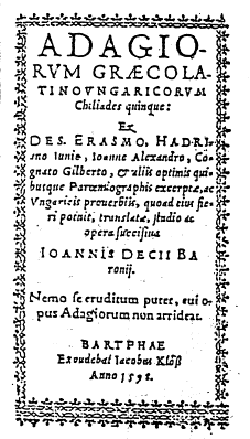 BD Baranyai Decsi János: Adagiorvm Graecolatinovngaricorvm chiliades quinque, ex Des. Erasmo, Hadriano Iunio, Ioanne Alexandro (Brassicano), Cognato Gilberto et alijs optimis quibusque paroemiographis excerptae, ac Vngaricis prouerbiis, quoad eius fieri potuit, translatae, studio et opera succisiua Ioannis Decii Baronij. – Excudebat Iacobus Klöß, Bartphae 1598. – (18) + (1–127) + 128–424 + (2) old. 12°. (RMNy-815)