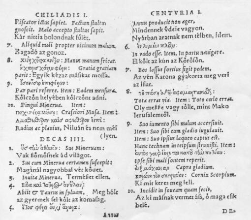 ErAd Erasmus, Desiderus: Des. Erasmi Roterodami Adagiorvm Chiliades qvatvor cvm sesqvicentvria, ex postrema authoris recognitione... Ex Officina Episcopiana, per Eusebium Episcopum et Nicolai Fr. haeredes, Basileae MDLXXIIII (1574), (116) 852 + 647 + (86) old., 2° Erasmus 852 oldalas szövege (l.l.11 – 5.2.51: Typographus lectori (1–96. hasáb), Adagiorum Appendix ex Erasmi Chiliadibus ad studiosum commoditatem excerpta (97–109. 1–160. sorszámok), Hadrianus Iunius (109–288. 840 tétel), Johannes Alexander Brassicanus (288–308. 146 tétel), Johannes Ulpius (308–316. 127 tétel), Gilbert Cousin (Cognatus) (316–602. 1810 tétel), Ludovicus Caelius Rhodiginus (602–606. 53 tétel), Polydorus Vergilius (606–610. 60 tétel), Petrus Godofredus (610–613. 36 tétel), Charles de Bovelles (613–617. 47 tétel), Adrianus Turnebus etc. (617–620. 30 tétel), Gulielmus Gentius (620–624. 50 tétel), Specimen quoddam adagiorum quae ab Junio, Cantero et Giselino... collecta sunt... (625–632. 49 tétel), Adagia of Melchior Neipeius (632–647.) (OSzK)
