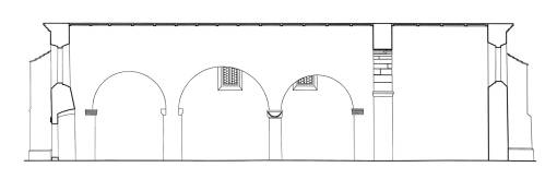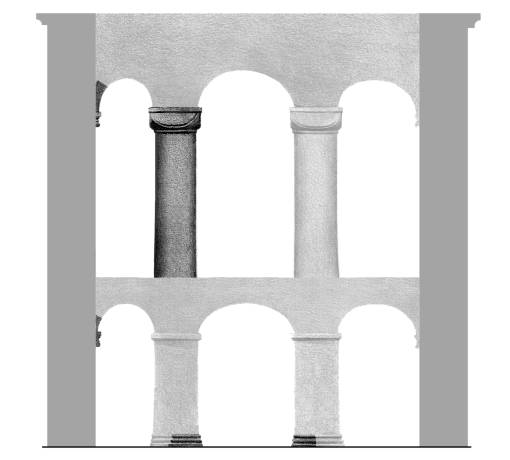 [33] A déli fal alsó vállköveinek a járószinttõl való távolságából meg tudjuk állapítani a földszinti árkád vállmagasságát. Az ugyanazon gyámkõre állított ívindításból ki tudjuk következtetni a földszinti árkádok ívmagasságát, melyhez hozzáadva egy adott bolthajtásvastagságot (melyet a hasonló méretû karzatok boltozatainak bolthajtása alapján állapíthatunk meg), megkapjuk a karzat emeletének a körülbelüli szintmagasságát. Ismerve az emeleti szintmagasságot, valamint a déli fal felsõ gyámkövének a magasságát, ki tudjuk következtetni az emeleti árkádok vállmagasságát is. Összevetve az emeleti és földszinti árkádok – egymástól közel 1 m-ben eltérõ – vállmagasságát az oszlop méreteivel, megállapíthatjuk, hogy ez jelentéktelen eltéréssel az emeleti árkádok alá fér be.