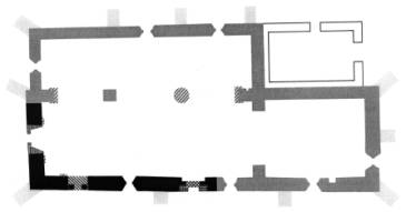 A fentiek mellett az elsõ épülethez tartoztak még a homokkõbõl rakott vakolatlan falrészek (a jelenlegi déli hajó nyugati zárófala és oldalfalának nyugati szakasza), akárcsak az elfalazott kisméretû félköríves ablakok.