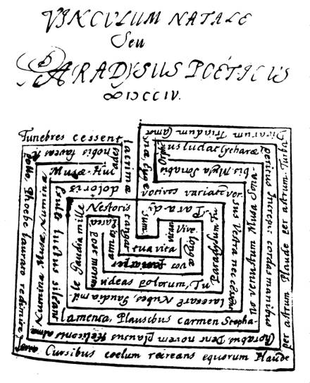 Feladványszerû, a labirintushoz egymásba futó görbe vonalaival és verssoraihoz közelítõ képvers az unitárius Kozma Mihály virág-verse is (1750, Kolozsvár). Érthetetlen is marad, ha nem leljük meg a helyes kezdõbetût: a kulcsot; és ez nem véletlenül P (a virág felsõ tartományában), hiszen a felköszöntött személy Pákei Judit.[22] A kiemelt nagybetûk rövidebb útját bejárva olvashatjuk magát a kívánságot: PÁKEI JUDIT ELLIEN.[23] A vers és a kívánság utolsó betûje (N) a kép, a virág középpontja: nem ki kell jutni ebbõl a labirintusból, hanem meg kell találni az utat a közepébe: a nõ szívébe.