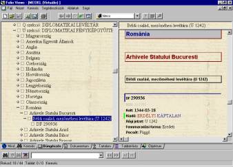 A középkori Magyarország levéltári forrásainak adatbázisa a korábbi oklevélkatalógus továbfejlesztett utóda, ám új kezelõprogrammal rendelkezik, ugyanis a korábbi CD keresõszoftverével nem sikerült megoldani a bevitt adatok javítását (holott pl. a rosszul feloldott keltezések, kifelejtett tartalmi említések miatt erre nagy szükség volt). A most használt Folio Wiews nevû program lehetõvé teszi az adatbázis folyamatos karbantartását, javítását. Ez azonban egy igen bonyolult, sokféle opcióval rendelkezõ program; ezen opciók teljes körû ismeretére általában nincs is szükség. A program használatáról egyébként a „Súgó” menü részletesen tájékoztat. Az oklevelek adatai a lemezen a levéltári proveniencia elvének megfelelõen vannak elrendezve: nyitáskor a dokumentum-ablak bal oldalán „Szintek”-re tagolt tartalomjegyzék található, és itt találjuk meg a MOL Q szekciójában levõ Diplomatikai Levéltárra (DL) és az U szekcióban levõ Diplomatikai Fényképgyûjteményre vonatkozó további információkat. Ezeken belül a következõ egységek találhatók: „Ország” (csak a DF-ben), „Intézmény”, „Állag”, „Oklevél”. Ezeket a +, ill. – jelekre kattintva nyithatjuk ki vagy zárhatjuk be. Legegyszerûbben ezen tartalomjegyzék segítségével lehet közlekedni az adatbázisban (lásd az 1. képet). Keresõsablon (ûrlap) teszi lehetõvé a könnyû és gyors keresést az adatbázisban („Keresés” menü). A keresés végrehajtása után a program kijelöli a találatokat; ezekre kattintva a kívánt szövegrészhez ugorhatunk.