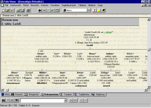 A genealógiai táblázatok a politikai szerepet játszó legfontosabb családok leszármazását tartalmazzák (lásd a 4. képet). Birtoktörténeti adatokat itt nem találunk, ám ezek legfontosabbja megtalálható az Archontológia nyomtatott változatának névmutatójában. A munka azonban sokban meghaladja Karácsonyi száz évvel ezelõtt megjelent, máig nélkülözhetetlen klasszikus kézikönyvét (Karácsonyi János: Magyar nemzetségek a XIV. század közepéig. Bp. 1900–1901), ugyanis sokkal több családot tárgyal, hasznosítja az elmúlt száz év forráspublikációit, továbbá a táblázatok nagy többségükben lefedik a XV. századot is (olykor a XVI. századra is kiterjedve). Hiánypótló voltát még inkább bizonyítja az, hogy – kéziratos formában – évek óta a magyar kutatók megbecsült segédeszköze.
